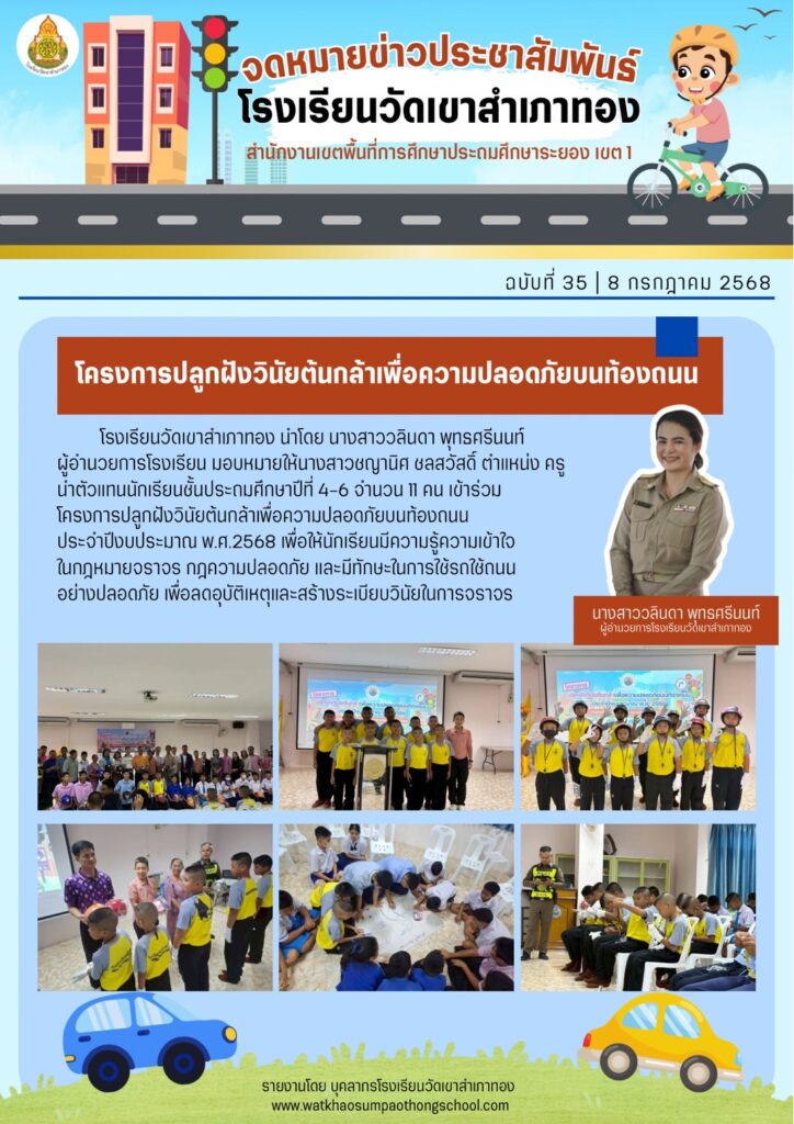 โรงเรียนวัดเขาสำเภาทอง นำโดย นางสาววลินดา พุทธศรีนนท์ ผู้อำนวยการโรงเรียน มอบหมายให้นางสาวชญานิศ ชลสวัสดิ์ ตำแหน่ง ครู นำตัวแทนนักเรียนชั้นประถมศึกษาปีที่ 4-6 จำนวน 11 คน เข้าร่วมโครงการปลูกฝังวินัยต้นกล้าเพื่อความปลอดภัยบนท้องถนน ประจำปีงบประมาณ พ.ศ.2568 เพื่อให้นักเรียนมีความรู้ความเข้าใจในกฎหมายจราจร กฎความปลอดภัย และมีทักษะในการใช้รถใช้ถนนอย่างปลอดภัย เพื่อลดอุบัติเหตุและสร้างระเบียบวินัยในการจราจร