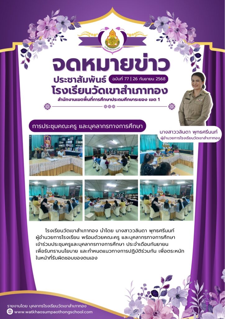 โรงเรียนวัดเขาสำเภาทอง นำโดย นางสาววลินดา พุทธศรีนนท์ ผู้อำนวยการโรงเรียน พร้อมด้วยคณะครู และบุคลากรทางการศึกษา เข้าร่วมประชุมครูและบุคลากรทางการศึกษา ประจำเดือนกันยายน เพื่อรับทราบนโยบาย และกำหนดแนวทางการปฏิบัติร่วมกัน เพื่อตระหนักในหน้าที่รับผิดชอบของตนเอง