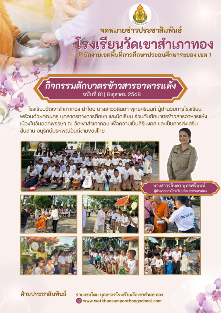 โรงเรียนวัดเขาสำเภาทอง นำโดย นางสาววลินดา พุทธศรีนนท์ ผู้อำนวยการโรงเรียน พร้อมด้วยคณะครู บุคลากรทางการศึกษา และนักเรียน ร่วมกันตักบาตรข้าวสารอาหารแห้งเนื่องในวันออกพรรษา ณ วัดเขาสำเภาทอง เพื่อความเป็นสิริมงคล และเป็นการส่งเสริมสืบสาน อนุรักษ์ประเพณีอันดีงามของไทย