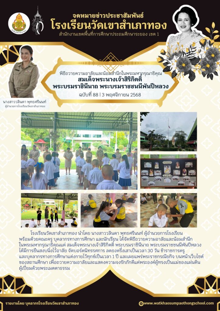 โรงเรียนวัดเขาสำเภาทอง นำโดย นางสาววลินดา พุทธศรีนนท์ ผู้อำนวยการโรงเรียน พร้อมด้วยคณะครู บุคลากรทางการศึกษา และนักเรียน ได้จัดพิธีถวายความอาลัยและน้อมสำนึกในพระมหากรุณาธิคุณแด่ สมเด็จพระนางเจ้าสิริกิตติ์ พระบรมราชินีนาถ พระบรมราชชนนีพันปีหลวง ได้มีการยืนสงบนิ่งไว้อาลัย จัดบอร์ดนิทรรศการ ลดธงครึ่งเสาเป็นเวลา 30 วัน ข้าราชการครูและบุคลากรทางการศึกษาแต่งกายไว้ทุกข์เป็นเวลา 1 ปี และเผยแพร่พระราชกรณียกิจ บนหน้าเว็บไซต์ของสถานศึกษา เพื่อถวายความอาลัยและแสดงความจงรักภักดีแด่พระองค์ผู้ทรงเป็นแม่ของแผ่นดิน ผู้เปี่ยมด้วยพระเมตตาธรรม