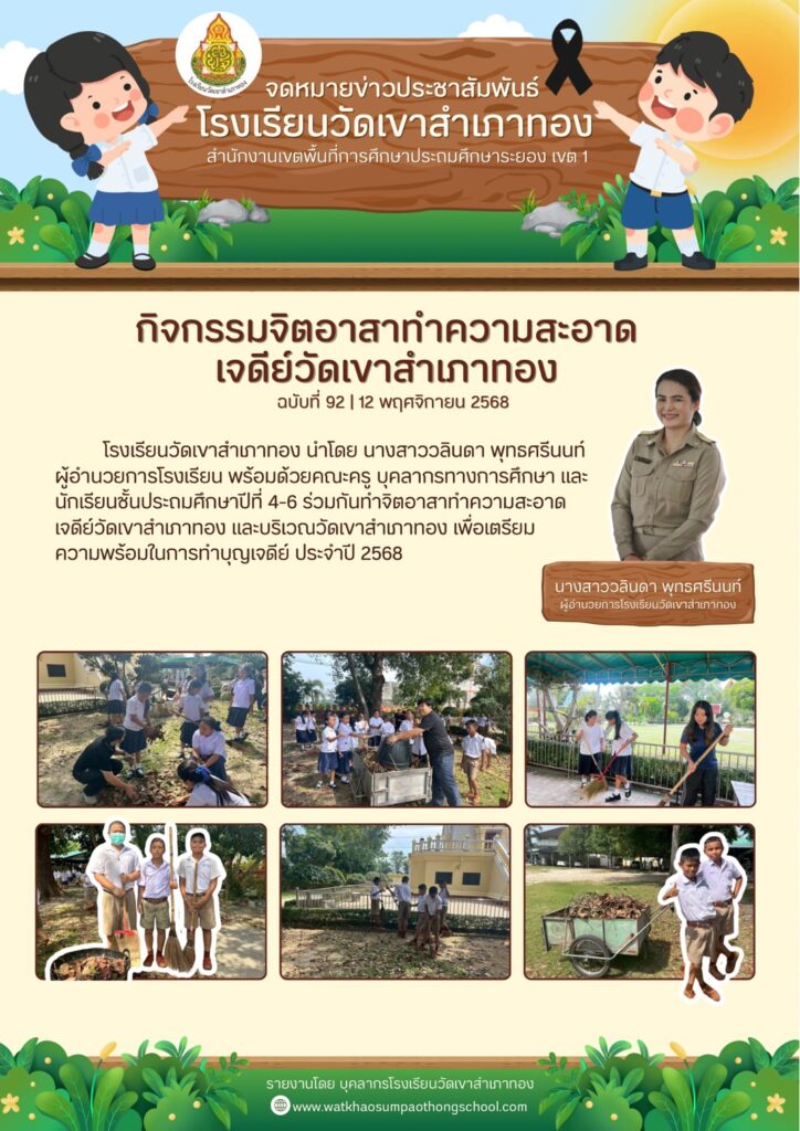 โรงเรียนวัดเขาสำเภาทอง นำโดย นางสาววลินดา พุทธศรีนนท์ ผู้อำนวยการโรงเรียน พร้อมด้วยคณะครู บุคลากรทางการศึกษา และนักเรียนชั้นประถมศึกษาปีที่ 4-6 ร่วมกันทำจิตอาสาทำความสะอาดเจดีย์วัดเขาสำเภาทอง และบริเวณวัดเขาสำเภาทอง เพื่อเตรียมความพร้อมในการทำบุญเจดีย์ ประจำปี 2568