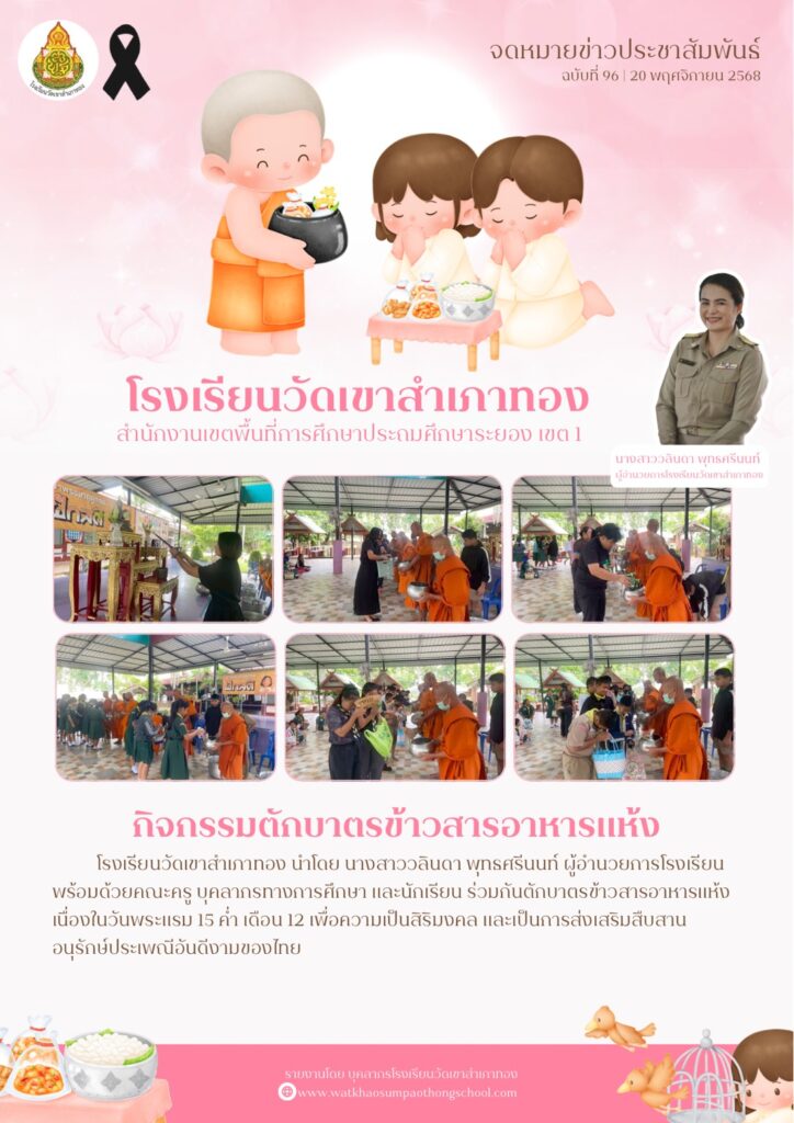 โรงเรียนวัดเขาสำเภาทอง นำโดย นางสาววลินดา พุทธศรีนนท์ ผู้อำนวยการโรงเรียน พร้อมด้วยคณะครู บุคลากรทางการศึกษา และนักเรียน ร่วมกันตักบาตรข้าวสารอาหารแห้ง เนื่องในวันพระแรม 15 ค่ำ เดือน 12 เพื่อความเป็นสิริมงคล และเป็นการส่งเสริมสืบสานอนุรักษ์ประเพณีอันดีงามของไทย
