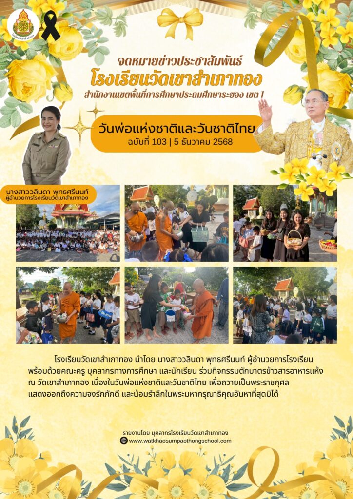 โรงเรียนวัดเขาสำเภาทอง นำโดย นางสาววลินดา พุทธศรีนนท์ ผู้อำนวยการโรงเรียน พร้อมด้วยคณะครู บุคลากรทางการศึกษา และนักเรียน ร่วมกิจกรรมตักบาตรข้าวสารอาหารแห้ง ณ วัดเขาสำเภาทอง เนื่องในวันพ่อแห่งชาติและวันชาติไทย เพื่อถวายเป็นพระราชกุศลแสดงออกถึงความจงรักภักดี และน้อมรำลึกในพระมหากรุณาธิคุณอันหาที่สุดมิได้