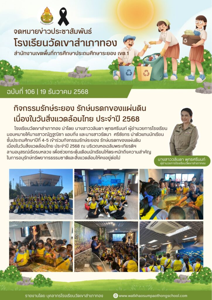 โรงเรียนวัดเขาสำเภาทอง นำโดย นางสาววลินดา พุทธศรีนนท์ ผู้อำนวยการโรงเรียนมอบหมายให้นางสาวณัฏฐณิชา แอบกิ่ง และนางสาวรัตนา ศรีชัยกร นำตัวแทนนักเรียนชั้นประถมศึกษาปีที่ 4-5 เข้าร่วมกิจกรรมรักษ์ระยอง รักษ์มรดกของแผ่นดิน เนื่องในวันสิ่งแวดล้อมไทย ประจำปี 2568 ณ บริเวณหอเฉลิมพระเกียรติฯ ลานอนุสรณ์เรือรบหลวง เพื่อช่วยกระตุ้นเตือนนักเรียนให้ตระหนักถึงความสำคัญในการอนุรักษ์ทรัพยากรธรรมชาติและสิ่งแวดล้อมให้คงอยู่ต่อไป