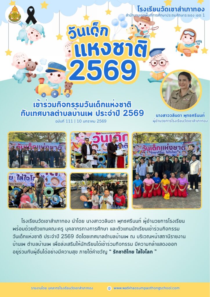 โรงเรียนวัดเขาสำเภาทอง นำโดย นางสาววลินดา พุทธศรีนนท์ ผู้อำนวยการโรงเรียน พร้อมด้วยตัวแทนคณะครู บุคลากรทางการศึกษา และตัวแทนนักเรียนเข้าร่วมกิจกรรมวันเด็กแห่งชาติ ประจำปี 2569 จัโดยเทศบาลตำบลบ้านเพ ณ บริเวณหน้าสถานีรายงานบ้านเพ ตำบลบ้านเพ เพื่อส่งเสริมให้นักเรียนได้เข้าร่วมกิจกรรม มีความกล้าแสดงออกอยู่ร่วมกับผู้อื่นได้อย่างมีความสุข ภายใต้คำขวัญ “ รักชาติไทย ใส่ใจโลก ”